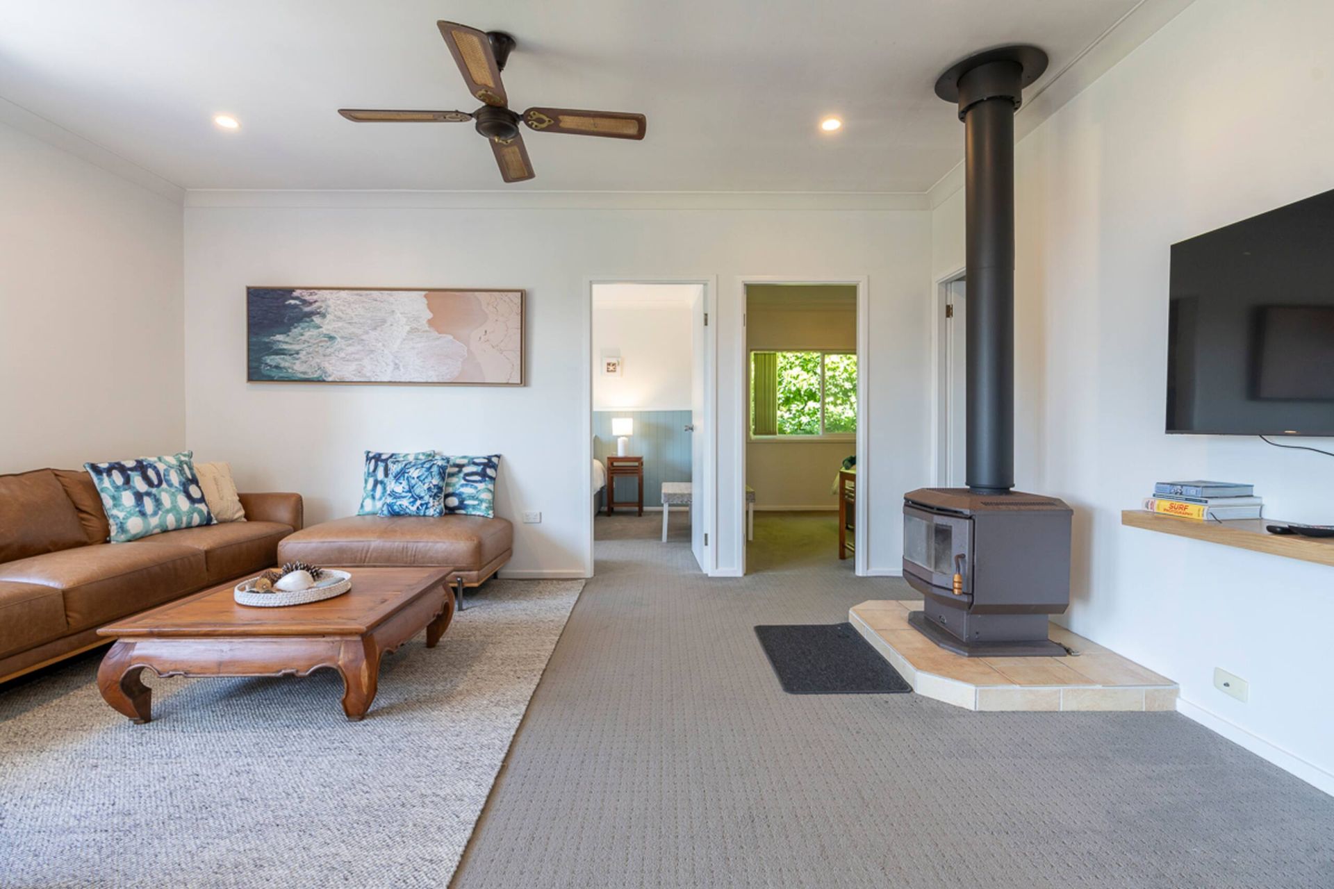 Enjoy a fully equipped kitchen with a dishwasher and Nespresso coffee machine, a cosy indoor fireplace, Wi-Fi, and a smart TV with Netflix and Foxtel for all your entertainment needs. Step outside to an inviting deck with a coffee or the courtyard for a BBQ, an outdoor shower for post-beach rinses, and enjoy the peaceful ambiance of the surrounding greenery.